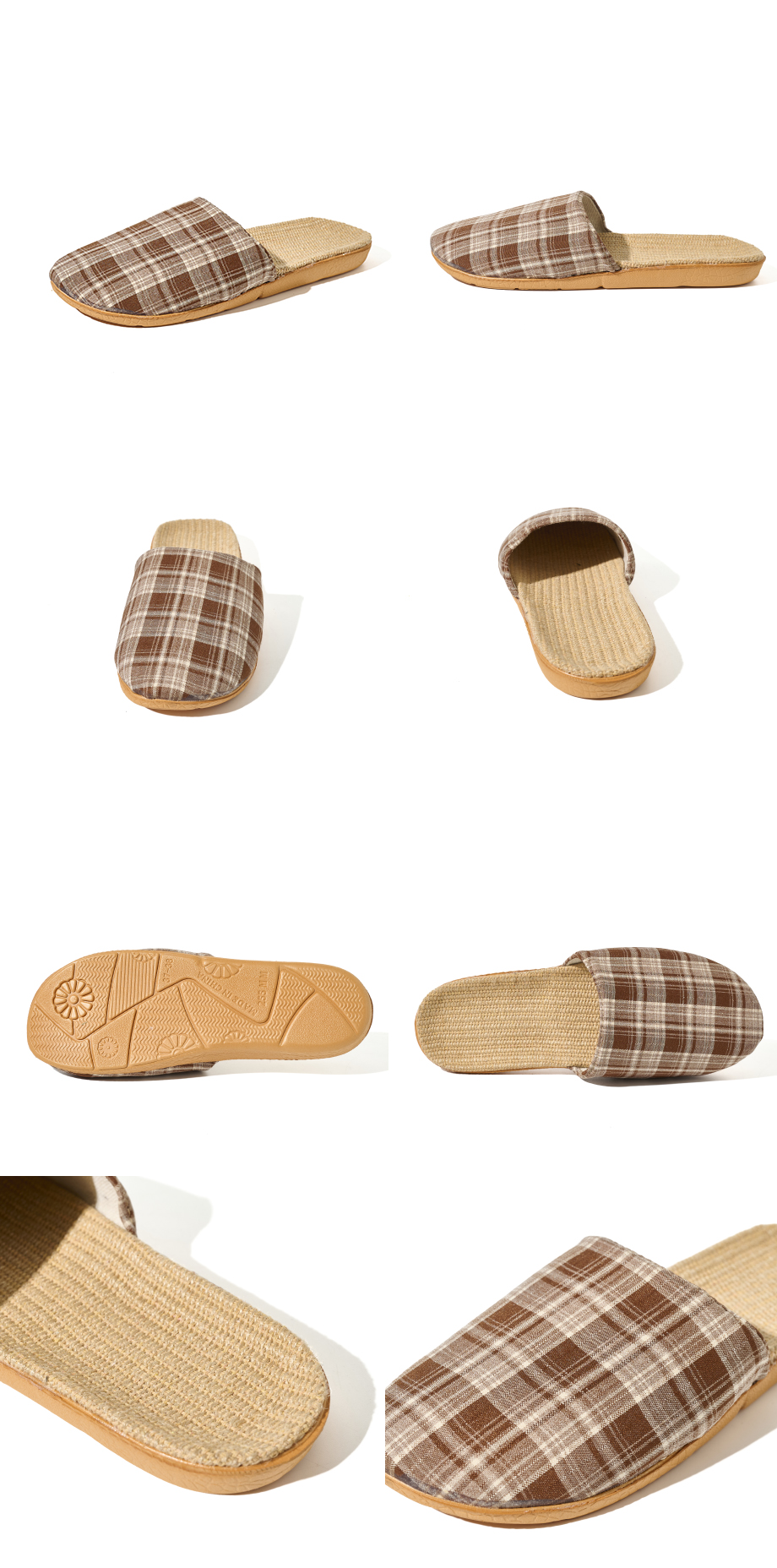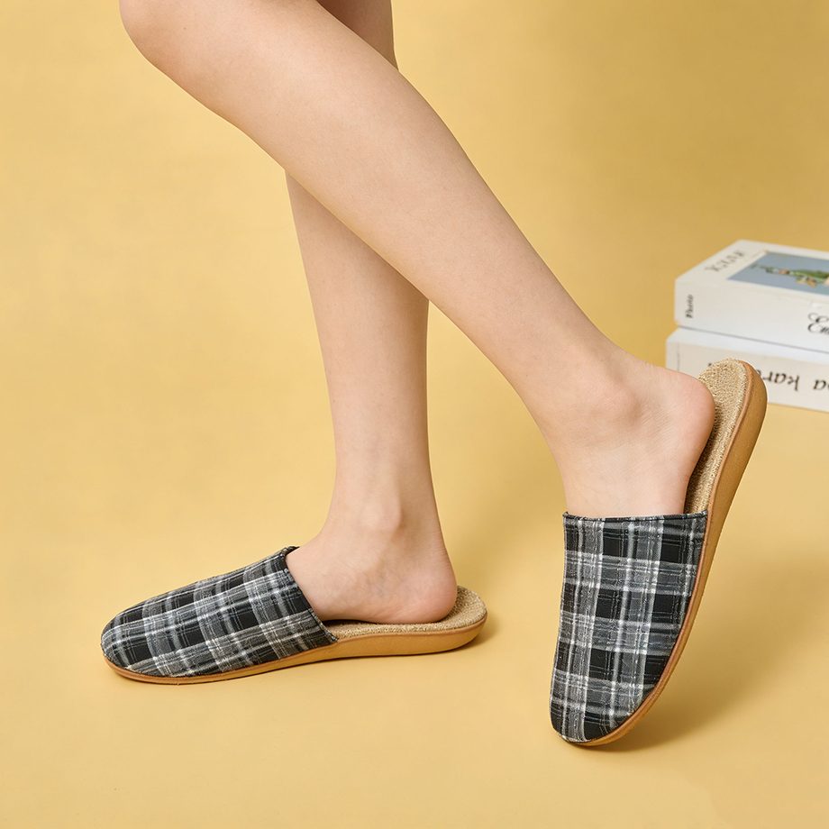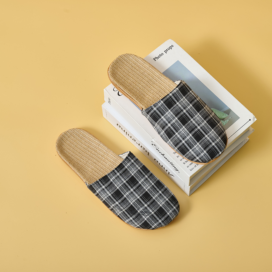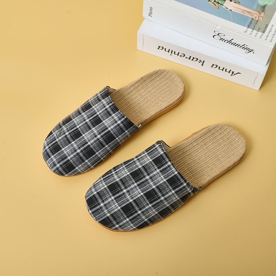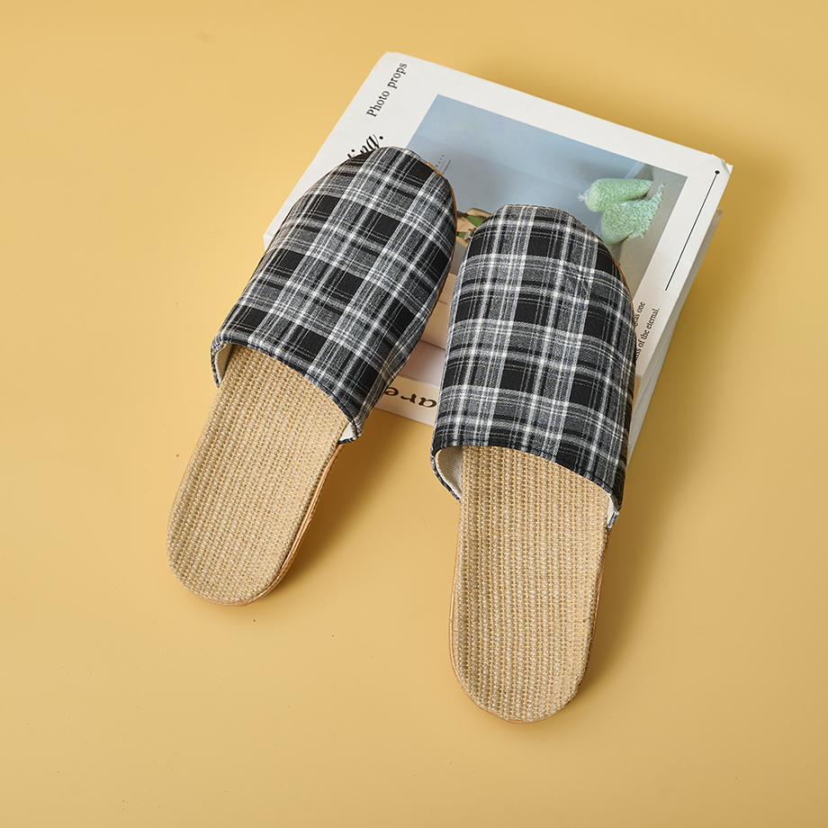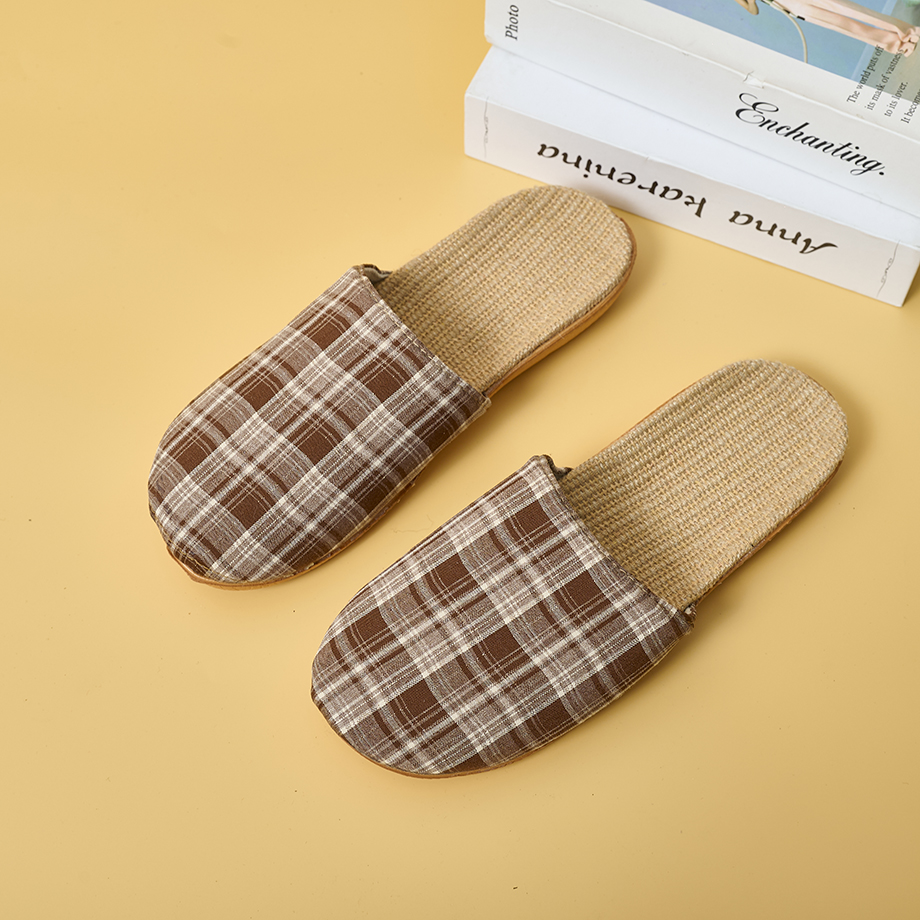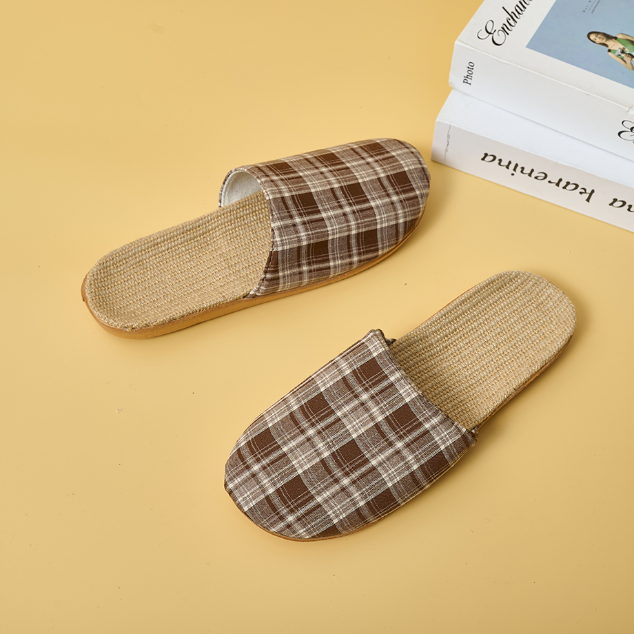 Custom Summer Round Toe Healthy Linen Minimalist Design Slippers Wholesale Comfortable Floor Plaid Bedroom Slippers